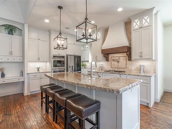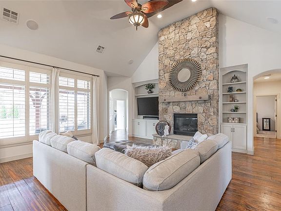 This stunning 4-bedroom, 3.5-bathroom home in Twin Bridges Addition blends luxury, comfort, and functionality in a highly desirable North Edmond location. Hardwood flooring flows throughout, complemented by built-in shutters and vaulted ceilings with wood beams in the main living areas. The chef's kitchen is a masterpiece, featuring a gas range with a custom plaster hood, pot filler, farmhouse sink with water filtration, double-slab raw edge granite island, Scotsman ice machine, and butler's pantry with built-in wine storage leading to a walk-in pantry. A formal dining room with wainscoting adds elegance, while the living room offers a stacked-stone fireplace, built-ins, and built-in speakers. The primary suite is a luxurious retreat with backyard access, windows overlooking the pool, a jetted Jacuzzi tub, a walk-in shower, a bidet, and a walk-through closet leading to the laundry room. A guest suite on the main level includes a private bath and walk-in closet, perfect for visitors or multi-generational living. Upstairs, a tower room and media room with built-in speakers offer entertainment spaces. Two additional bedrooms feature walk-in closets, with one enjoying Jack & Jill bath access. A hallway nook with built-in desks adds functionality, while wrought iron stair railings enhance the home's character. The backyard oasis boasts a salt water pool with a diving board, a hot tub with bubblers and a waterfall, a covered porch with a ceiling fan, an outdoor fireplace, a built-in KitchenAid grill, and a Traeger Smoker—perfect for entertaining. Heritage Elementary School is attached to the neighborhood and is within walking distance. This home offers the perfect blend of elegance and practicality in Twin Bridges Addition. Schedule a private tour today!