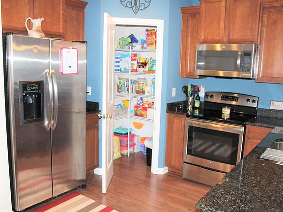 - RoomKitchenFeatures: Granite Counters, Pantry, Recessed Lighting, Cabinets-Stained, Floors-Laminate, Bar