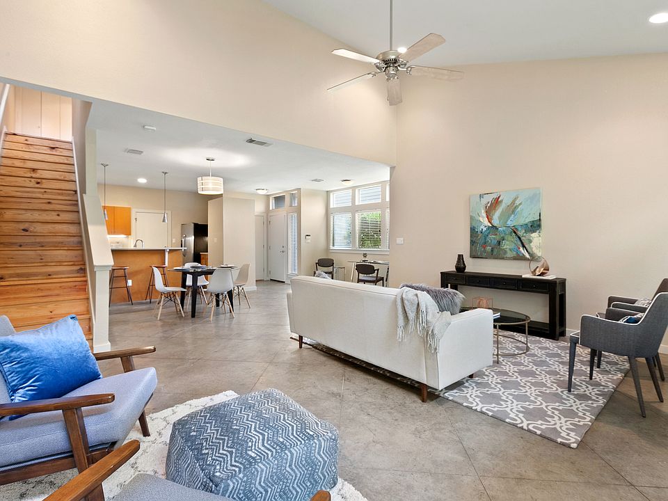 Modern loft-style condo, 5 minutes to airport and 7 minutes to downtown. Ideal lock and leave location for anyone on the go. Open living and kitchen downstairs, with large, over-sized bedrooms upstairs. Large windows create natural light throughout. Beautiful Silestone counters in kitchen and breakfast bar, with ample storage in pantry and cabinets. Water Heater and HVAC replaced in 2018. Google Fiber ready. 1 car garage + car port. All appliances convey! Please show responsibly.
