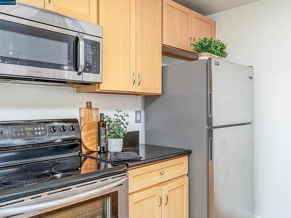 Washer and dryer hookups can be requested with the HOA! This top-floor, end unit, 2 bedroom, 2 bathroom condo offers an unparalleled living experience with courtyard views, a pool, gym and 2 parking spots. Located 2 blocks away from the Public Market, minutes to the Berkeley Marina and easy access to major freeways, this residence combines modern sophistication with the convenience of urban living. Step inside and be captivated by the spacious light-filled open floor plan, inviting living room, with a fireplace included. The well-appointed kitchen includes ample storage space, and a stylish breakfast bar perfect for entertaining.The primary bedroom is a true retreat, offering an en-suite bathroom, and 2 closets, one being a walk in closet. On the opposite side of the home is the second generously sized bedroom, including a walk-in closet. As an added bonus, the condo building offers a gym and community room. With top-tier security measures in place, 2 deeded parking spots, and proximity to popular dining and entertainment spots, this condo provides the ultimate urban living experience.