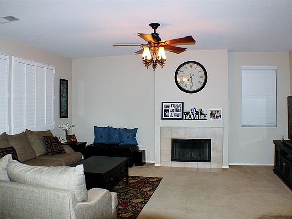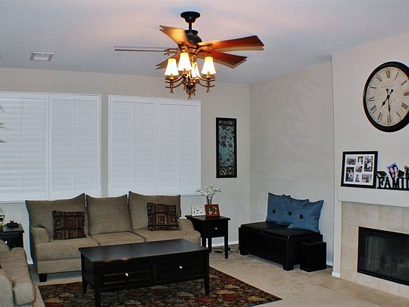 This lovely home has an open floor plan and is move in ready with 16 inch tiles in kitchen and entry. The kitchen has a large island and lots of storage as well as a large pantry and separate laundry room. There are two fireplaces - one in the family room and the other in the master bedroom. The family room is upgraded with plantation shutters. There is a downstairs bedroom and bathroom. The master bathroom has separate shower and soaking tub and dual sinks. The master is spacious and has an extra large walk-in closet. The large backyard is perfect for entertaining with a lovely outdoor living area that features an aluma-wood arbor with built-in fans and lights as well as misters as the center piece of this low-maintenance backyard. This three bedroom home with a loft could likely be converted to a 4 bedroom. There is also a 3 car, tandem garage.