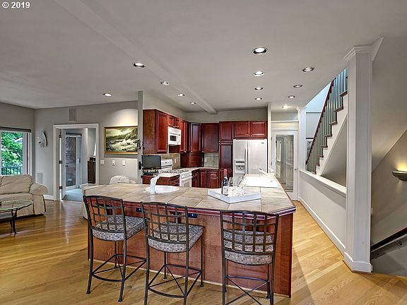 It's a unicorn, rare hard to find John's Landing Multi-Generational/ dual living home that is packed with options.Stunning street appeal with a French inspired Mansard Roof, this 2 story home with an incredible top deck featuring 360 degree seasonal views of the river, city and neighborhood, is self sufficient on each level with Kitchen/laundry and separate meters. Fabulous location near dining, shopping, grocery and transportation. Remodeled main floor is a great short/long term rental option. [Home Energy Score = 1. HES Report at https://rpt.greenbuildingregistry.com/hes/OR10111933]