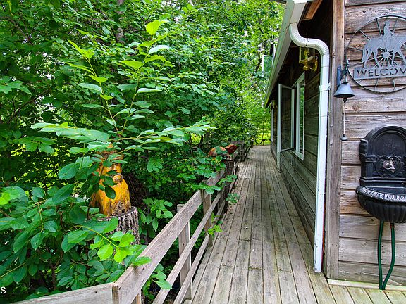 Single owner home nestled on a 2.3 acre wooded lot. The exterior is unique barn wood with a gambrel roof. Living and dining rooms feature oak hardwood floors and look out on an enchanted forest. A wrap around deck for entertaining or bird watching. There is a wood burning stove for cozy winter evenings. Spacious kitchen features recently updated appliances. Main floor also has a mud room, guest room, laundry room and a three quarter bathroom. Upstairs primary bedroom with a large walk in closet offers a stunning view that opens to a deck that has a retractable awning. Two other bedrooms, an office, and a full bath with a step in tub. Above the two car garage is a heated work shop. There is a large storage shed on the property. Make an appointment soon to see this one of a kind home!