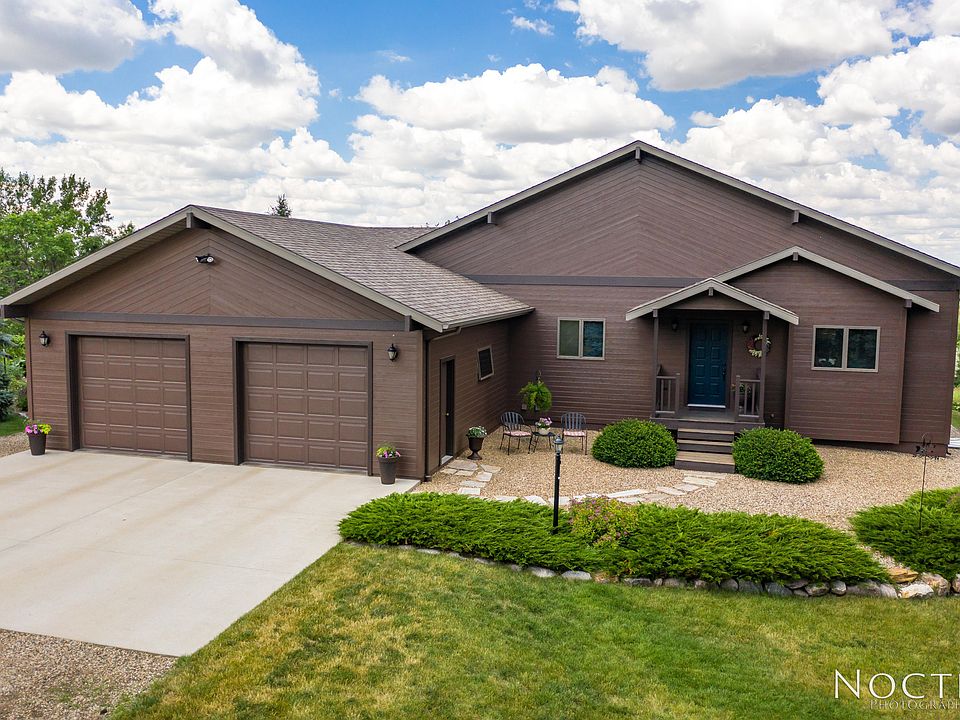 Astounding views are just one of the highlights of this home for you, your family and friends to enjoy. Inspiration awaits both inside and outside. Many recent quality updates abound. You will enter to gorgeous new Plank Flooring in the foyer, kitchen, and great room - whose soaring, beamed cathedral ceiling is enhanced by custom architectural windows. The view over the Missouri Valley is simply spectacular! There is new carpet in the main floor Master Bedroom, new flooring in the Master Bathroom as well as dual vanity sinks with quartz counter tops, new fixtures, and a contemporary soaking tub. The master bedroom also offers a private entry to the deck with breathtaking views to accompany your morning coffee and glorious evening sunsets. The kitchen is a chef's dream - stainless steel appliances, granite counter tops, kitchen island and plenty of cabinets - hand crafted by Klementson Woodwork. The exterior has been freshly painted and it is beautiful! This home is meticulously maintained and landscaped to perfection. There is a pond, garden, potting area and gravel walkways for relaxation. The main floor laundry/mudroom is just off the impeccably cared for garage. The lower level (8 ft ceilings) fills with light from the walkout doors and egress windows - in all three bedrooms. The walkout patio is covered and there is a fire pit area. The Spacious family room has a gas stove with plumbing for a wet bar. Dual zone heating system, April Aire, Exterior walls 2 X 6 construction with R 21 insulation R 50+ insulation in home and garage attics. Garage has water, floor drain, insulation, and electric heater. The property is its own subdivision and is ZONED FOR 2 HORSES. A 2400 sq. ft. shop could be built with appropriate permit. No Open Houses - private showings only so please call your Realtor to experience this one.'