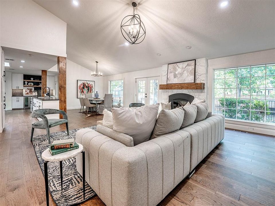 Gorgeous remodeled and updated home in the gorgeous neighborhood of Warwick II. This beautiful, peaceful home is nestled in the middle of a beautiful street full of beautiful trees and established landscaping. Enjoy quiet mornings and evenings on your back covered patio that overlooks the greenbelt and walking trails and just steps away from the neighborhood ponds and playground and beautiful clubhouse. The house boasts beautiful tall ceilings and wooden beams when you enter the front door. The very spacious living room is surrounded by large windows and glass doors that open up to the back yard and offer so much wonderful natural light. Primary bedroom is a home owners delight. It has two closets, elegant soaker tub, separate vanity areas, and large walk-in shower. Home has engineered wood floors, new fans, outside of home is newly painted, added wiring and plug in garage for electric vehicles, Nest thermostat, new range, and so much more. You have to see this house, it is truly a peaceful gem.