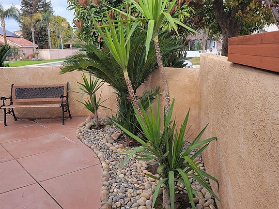 Gated courtyard home with artistic features, granite counter tops and a kitchen island, 2 living areas, formal living and dining area. Family room has top to top, wall to wall sliding door. Storage through out the home. Spacious 3 bedroom, 2 bath. Master bathroom has a dual sink and separate shower and garden tub, master room high ceilings. Concrete backyard with palm trees.