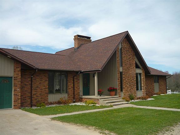 Spacious, immaculate brick ranch in the middle of 30 gorgeous acres. Custom built 3 bed, 3 bath ranch with full basement, attached garage and functional barn. All set up to enjoy raising and training horses or, as hobby farm. The 2500+ square foot ranch has open floor plan, spacious rooms, cathedral ceiling and stunning two-sided split field stone fireplace. Everything good comes from the kitchen. This large island kitchen has oak cabinets, double ovens (gas cook-top and one of the ovens is convection) Adjacent family room with northern views and genuine stone fireplace. South side living room with floor to ceiling southern views and the other side of the soaring floor to ceiling fireplace. Adjacent formal dining room with gleaming hardwood flooring. Large main floor utility room, half bath, mud room and walk-in pantry. Three bedrooms and baths all on the main level. Spacious master suite with private bath. Full basement is sectioned for organization - storage, mechanical room (with fi