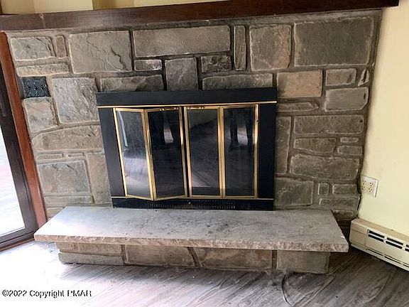 - Description: stone corner fireplace, laminate flooring