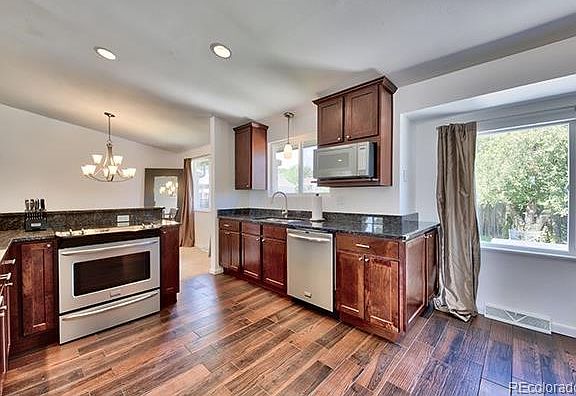 Wonderfully remodeled home with extensive upgrades in Arvada! All new flooring throughout including carpet in bedrooms & living areas, stunning wood-like tile in kitchen & tile in bath & laundry. Great room opens to kitchen with pantry, breakfast bar, granite counters, L-shaped island with SS sink, 4 inch backsplash, shaker style cabinets & separate dining room. Master with ceiling fan & private master bath, 2 additional bedrooms & additional bathroom on upper level. All bathrooms updated with new cabinets, sinks, faucets, toilets, tub/shower & granite counters. Lower level family room with gas fireplace, powder room & laundry. Basement with rec room, non-conforming bedroom and storage. Fenced yard with large patio, new sprinkler system & new RV/boat parking on side of house. Newer windows, light fixtures, exterior paint, garage door & furnace. A true beauty in a quiet neighborhood just minutes from Faversham Park, Apex Center, retail & restaurants.