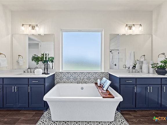 The primary suite offers a spa-inspired escape with a freestanding soaking tub, mural accent tile, and a fully tiled shower. Dual Amazon Echo system. Smart entry keypad and thermostat create effortless living.
