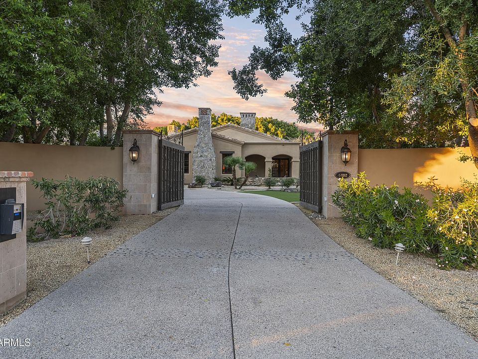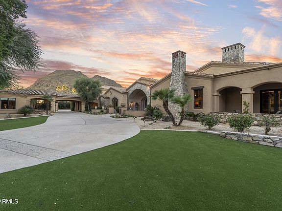 Completely walled and electronically gated with security surveillance cameras on 2.26-acres of lavish grounds adjacent to Phoenician Resort. Perfectly nestled in the heart of Paradise Valley, this Mediterranean Architecture estate was meticulously built and landscaped with the ability to expand to its seven-car air-conditioned garage. Room to add an RV Garage, Tennis/pickleball or other sports courts here. The grand residence boasts six luxurious bedrooms, 7 bathrooms plus 2 powder baths, soaring ceilings adorned with detailed craftsmanship and private patios for each... The split floor plan allows the primary to remain private, it features a spacious sitting room, dual spa-inspired baths, and furniture-grade walk-in closet cabinetry. Central to the home is a gourmet ... See Motion Video kitchen designed for exquisite entertaining, seamlessly flowing into a grand family room and an elegant wet bar, adjacent to a sophisticated dining room and walk-in wine cellar. The home offers a theater, game/billiards room, exercise room, library, and study. Mature landscaping throughout, features covered patios, a Ramada, a fireplace, a heated pool, plus a jacuzzi; perfect for relaxation or grand events. A well-appointed 1,401 sq ft guest home complete with full kitchen adds to the estate's luxury, making this home a pinnacle of secluded elegance and an ideal setting for those who value privacy and exclusivity.