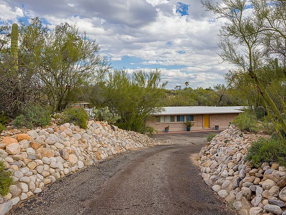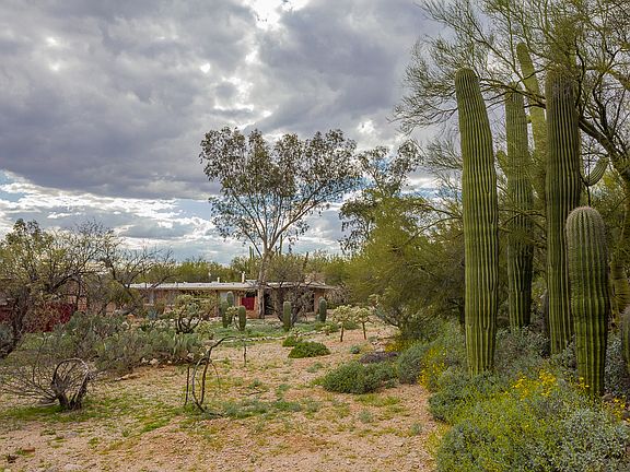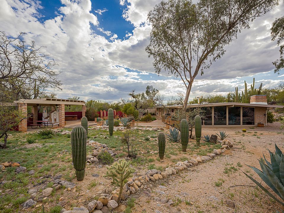 Classic mid century Tom Gist home. Stunning views, private lot, and cozy charm abound in this 1960s territorial home. Nestled on 1.5 acres, this 4 bed, 3 bath desert haven ready to be yours! Enter to find lovely exposed brick throughout living room, and a full wall of glass on the north side for optimal viewing enjoyment looking toward the Catalinas. Attached guest quarters with separate entrance for additional privacy, perfect for guests or MIL suite! Ample covered parking with garage and 3 car carport. Beautifully maintained desert yard complete with large ramada and hot tub. Come see what makes this house such a unique and charming find!