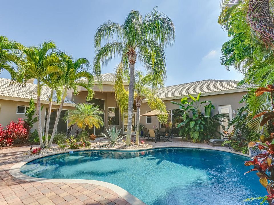 Absolutely Stunning Lakefront Courtyard 4 Bedroom Home with all the Upgrades. From the moment you walk in you find paradise with the gorgeous pool that was recently redone with tropical landscaping and the covered bar adjacent to the guest house. This courtyard is like being in a 5 star resort. The first thing you see when you walk in to the Main House are the panoramic views of the lake and the openness of the home. Upgrades Galore from the recently modern paint both inside & out, to the updated kitchen that has granite countertops, raised panel cabinets and GE profile appliances, to the Hard Wood Floors & Saturnia Marble floors, to the plantation shutters, and of course all windows treated with 8 mm armocoat hurricane and tinted film.