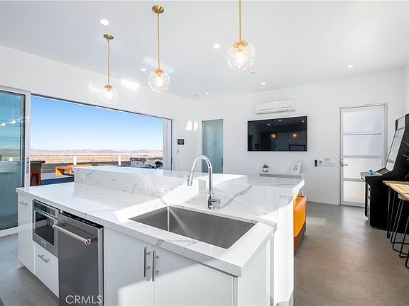 Welcome to a modern, activity-packed masterpiece just outside of Joshua Tree National Park.This home has desert views for days to impress even the harshest of critics. Stargaze from the deck with expansive desert views. There is an outdoor theater and hot tub under the milky way. Inside there are floor to ceiling windows bringing in sunshine and views. A sixteen foot wide glass door slides completely into the wall. White lines create a calm and soothing atmosphere. In this open floor plan the living room sports a soft leather sofa (Scandinavian Designs Queen Pull out Sleeper Sofa) . an arcade video game with all the games you could imagine. A gourmet kitchen with stainless steel appliances, solid surface counters, tiled backsplash and dramatic black and white contrasting colors. Enjoy delicious meals at the large kitchen island for four or at the window bar for four overlooking the stunning view of mountains and desert. Two bedrooms, each with luxurious spa inspired ensuite baths. Each suite offers a king size bed and bathrooms with oversized walk-in rain head showers. Outdoors is a new Ping Pong Table and outdoor movie theater! On the spacious back deck, you’ll enjoy a large lounge area with enough seating for at least 8, centered around an elegant fire feature with new wooden benches. A large outdoor kitchen with gas grill offers the grill-master a chance to shine! Savor dinner at the outdoor dining table.After dinner enjoy on the side of the house billiards, under its own covered patio. This home is a must see....