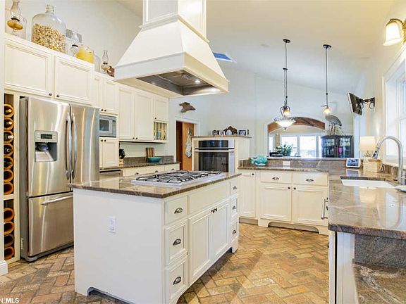 Exceptional location! This mid-century modern bay house on 3 acres was extensively remodeled in 2007 w/attention to detail, featuring well crafted natural elements including solid fir, cedar and juniper, hand cut stone, exposed beam, wrought iron and brick, bringing the outdoors in. Built to last and lives well, with open airy high ceilings and picturesque views of the bay. The front entrance opens to a wraparound grand hall w/"sleeping porch" area reminiscent of days gone by. Custom gourmet island kitchen boasts granite, 5 burner gas cooktop, stainless appliances, & wine cooler. The dining area and butlers pantry/bar are well suited for gatherings. The living room offers solid juniper, built-in bookshelves, and hand cut stacked stone wall w/ wood burning FP. Graceful archways welcome you to the observation porch showcasing the natural beauty of stately oaks, wildlife and stocked heart pond. Split bedroom plan offers a dreamy master suite w/stained bead board ceiling and wall of bay front windows. The huge master bath inc dual vanities plus makeup area and walk-in closet with built-ins. Two bedrooms w/new lvp floors and a full bath located near the spacious laundry rm & pantry. Upstairs media/game room w/built-in queen bed, full bath and walk in closet. Cross the elevated walkway to the upstairs balcony for splendid views and breezes! Enter the bayside covered veranda through French doors from the great hall or master & soak in the hot tub or grill and dine al fresco. The 720sf guest cottage has beautiful ceiling details - ideal for artists, teens, or mother-in-law. Collectors and outdoor enthusiasts will be thrilled by the 30'x70' workshop inc 5 bays w/storage galore for all the toys. There's an office, tool storage rm, rough-in plumbing for 1/2 bath, cedar closet & upstairs storage. Minutes to downtown Mobile. Abundance of shopping, parks and restaurants nearby. Walk to the Mardi Gras parade! Sandy beach shoreline - wade directly into the bay, no bulkhead needed!