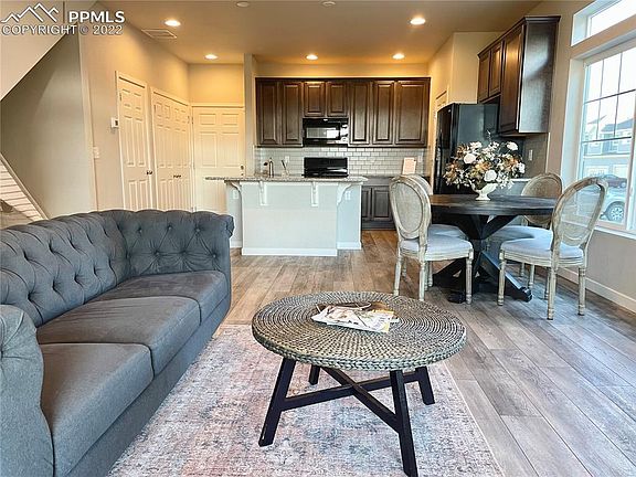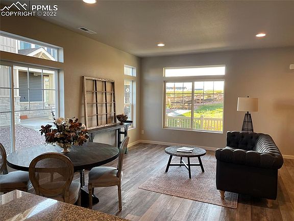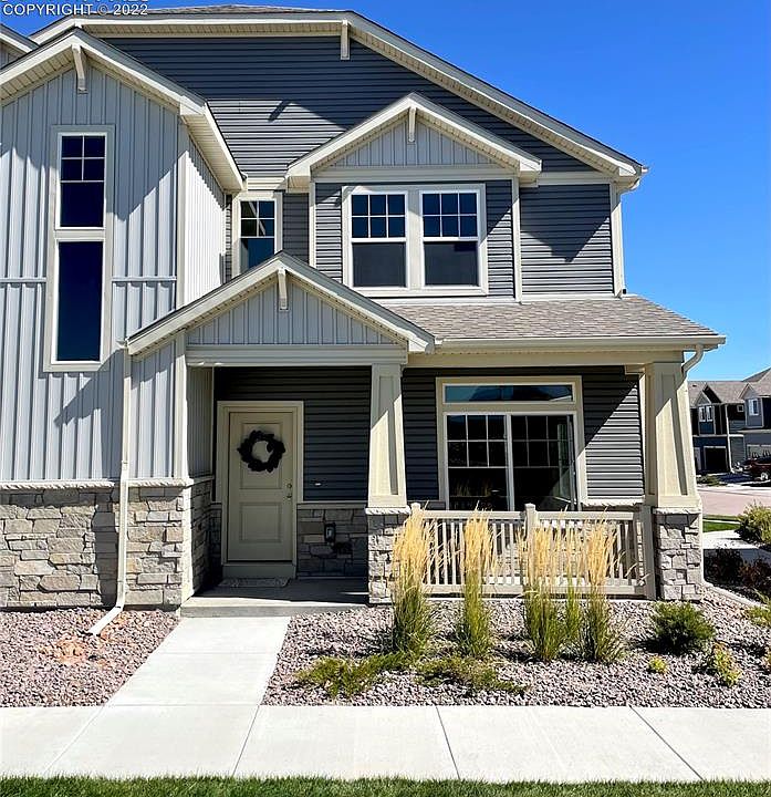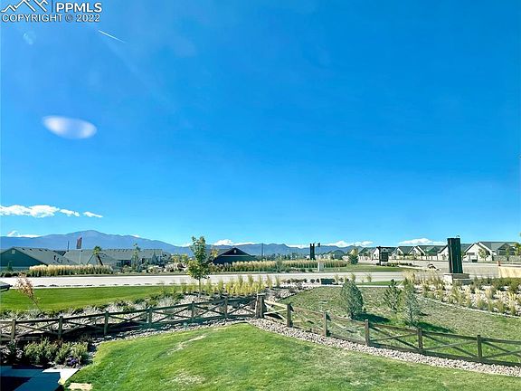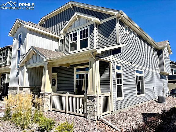 This gorgeous 2 story single family, attached home is located on a spacious corner lot with Pikes Peak Views in Banning Lewis Ranch. A well laid out 3 bedroom, 3 bathroom home awaits you. Upgrades, upgrades upgrades! Features include granite in kitchen and all bathrooms, tiled showers instead of shower inserts, gas range and oven, A/C, Smart garage door opener, pull out drawers in lower kitchen cabinets, a large kitchen island and more! The main level is bright and open, has a half bath, big beautiful windows, a nice kitchen with tall cabinets, dining and a comfortable living space. Upstairs is the large master suite with Pikes Peak views, a private bathroom including a double vanity, walk-in shower, walk-in closet and private toilet area. There is a full guest bath, 2 more bedrooms and the laundry room. You will love the feel of the upgraded carpet too! Step outside the front door to community open space, it feels like your own front yard. All landscaping, snow removal (including your driveway), trash removal and recycling are included in the Metro district monthly fee. Enjoy all of the community features Banning Lewis has to offer! ~Fitness center, Pickleball, pools, tennis, walking paths, parks & more.~ This home is only two years old and beautiful. Come take a look!
