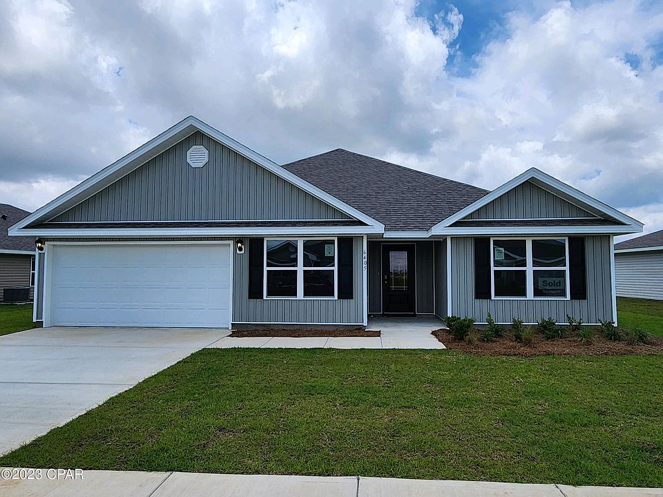 When you enter the Sawyer floorplan through the beautiful prairie door, you are amazed at the brightness and width of the entry way into this 5-bedroom, 3 bath, 2,483 square foot home. With 2 spacious bedrooms off the main entry way separated by a full bathroom and another secondary bedroom across the entry way on the opposite side, your guests and children are afforded privacy at the front of the home. Walk a few steps beyond and enter the open family room with a large area for an office or formal dining room. Overlooked by the huge kitchen island with a spacious breakfast area to the side. The kitchen features a walk-in pantry, beautiful white cabinets, and laminate countertops. The primary bedroom and bathroom are located off the back of the home featuring lush carpet flooring in the bedroom and luxury vinyl plank in the bathroom. The bathroom offers a soaking tub, large shower, double sinks, and a large closet. The covered back porch is sizeable, private, and is designed for easy in screening. The fifth bedroom and bath are located off the back of the home. This 4 sides vinyl home is situated on a large lot, sodded on 4 sides, located amidst beautiful trees, ponds, and fountains.