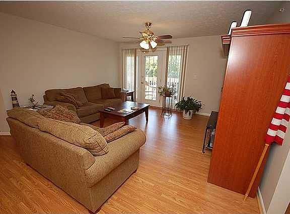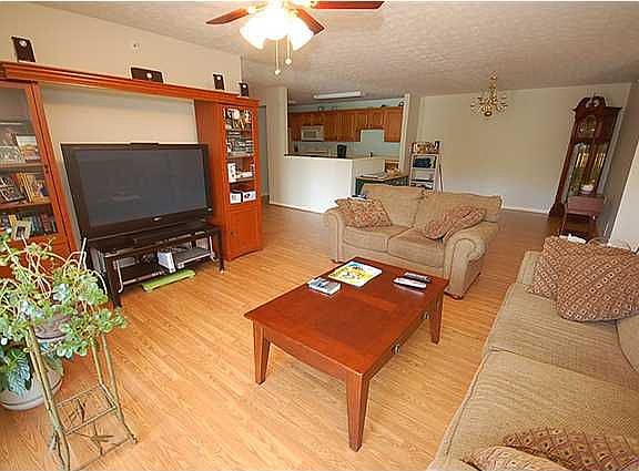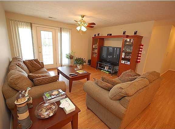 Cozy 2nd floor condo with an open floor plan. Beautiful wood laminate floors installed last year in great room, dinning room and hallway. The eat-in kitchen offers wood floors, plenty of cabinets, large pantry, refrigerator, stove, dishwasher and microwave. Kitchen is open to both dining room and great room with breakfast bar. The spacious great room walks out onto your private deck. Split bedroom design. Master suite is king size with two walk-in closets and a private, bath with dual vanities. The second bedroom is also very spacious and offers a walk-in closet. Large office could also be third bedroom or den. Facilities include an in-ground pool, fitness room and clubhouse (also available for private reservation). One reserved parking space is assigned along with an attached one car garage. The maintenance fee also includes water, exterior maintenance, master insurance, visitor parking, and access to the clubhouse, pool and fitness center. Convenient to Oldham County schools, expressways and shopping.