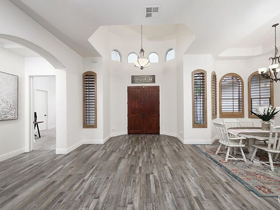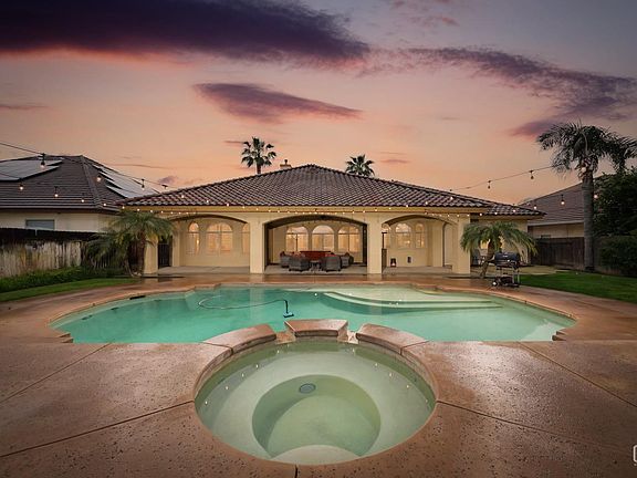 This stunning four-bedroom, 2 1/2 bath NW Bakersfield home features an open split-wing floor plan with towering ceilings, custom solid wood double front doors, and an impressive, luxurious entryway. The family room boasts a vibrant shiplac accent wall, a split-face stone fireplace, and captivating views of the backyard. The kitchen offers granite countertops, stainless steel appliances, extra cabinetry, and a large center island. The spacious master bedroom receives ample natural light and includes a generous walk-in closet and a jetted tub. The large backyard is an oasis with a pool, spa, and a large covered patio with ceiling fans. Great schools, shopping, and restaurants are all close by.