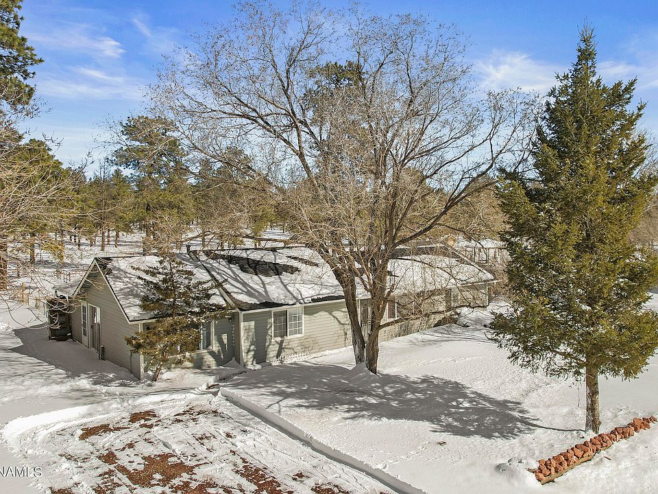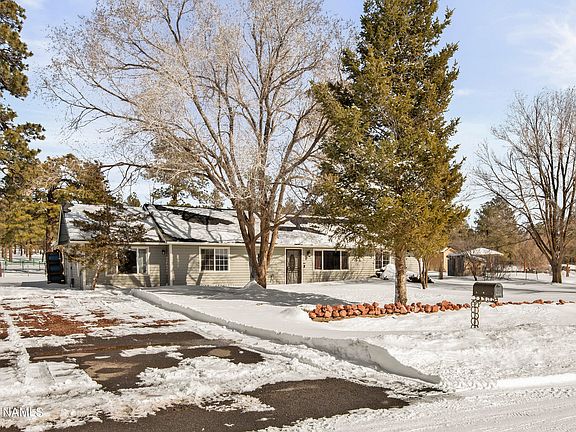 1-ac backing to Coconino National Forest for the ultimate outdoor lifestyle. Bonus from the front yard you can enjoy views of Mt. Elden and the San Francisco Peaks. This versatile single level home has been designed for many living situations: one large home (4 bedrooms, 3 baths & flex/game room) or two separate living quarters for the ultimate multiple generational retreat or income unit (all under one roof & no HOA). One side features a great room, dining room, kitchen, wood stove, 3 bedrooms (split layout), 2 full baths. The 2nd side a completely self-sufficient guest quarters with separate entrance: full kitchen, great room, wood burning stove, bedroom with en-suite connected by a shared laundry room. The backyards has been loved with lush gardens, covered patio fully fenced backyard. Roof replaced in 2021 with Fully owned solar panels, google nest thermostat, and rainwater catchment systems are just a few green elements to the home. Horses will love their new home: pull around driveway, steel livestock shelters, arena, multiple storage sheds and miles of trails right out the back fence. Schedule your appointment today!