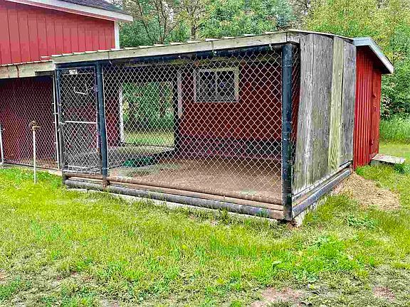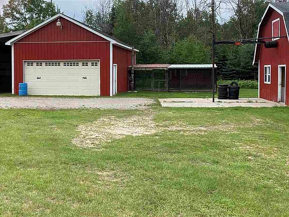 COUNTRY ESTATE Check out this great new listing with so much to offer and endless possibilities. This Ranch home with inviting covered porch has an attached finished heat garage w/entry into the large Mud/Laundry room w/lots of cupboards & pantry & door leading to the private patio. Inside the kitchen w/lots of cupboards & all the appliances opens to the dining area & den/study area. The great room won't disappoint and has open staircase going to the partial unfinished basement with cold storage room for all you gardeners or Wine connoisseur's just waiting for for your finishing touches. Main floor bath has lots of storage and a jet tub. Primary bedroom with large bath all handicapped accessible with custom Amish made cabinetry. There are three barns all with their own features and endless possibilities one has a custom dog pen with interior feeder. All located on just under 3 acres and minutes from State Land and Lakes with ATV trails and field trials.