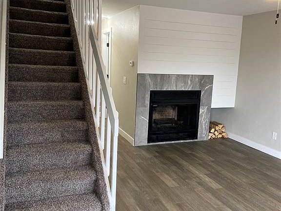 Beautifully remodeled end unit condo. Convenient location with easy access to I-25. White soft close kitchen cabinets complimented by granite countertops and new stainless steel appliances. Recessed lighting throughout the kitchen. French doors open up to a private wood deck. Large living room boasts a beautifully tiled wood burning fireplace. Main level includes a convenient half bath plus a laundry closet with a new high end washer/dryer combo. All ceilings have been retextured with a modern look, new paint, two panel doors with new hardware, tall trim throughout. Main level flooring is low maintenance luxury vinyl. Upstairs are two large separate and carpeted bedrooms each equipped with a newly renovated full bathroom and spacious closets. There is ample recessed lighting in each bedroom and plenty of natural light along with tall ceilings. No cost spared in renovating this beauty. A Must SEE and a must BUY!