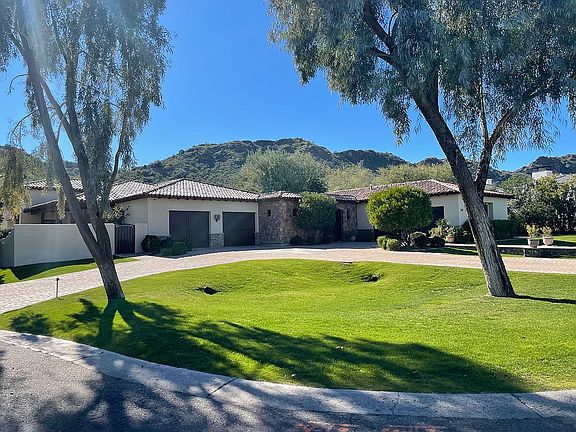 Located on a private cul-de-sac location with uninterrupted views of Mummy Mtn, there are few locations in town to top this! With four bedrooms (possible 5 with den), a separate guest house, and an entertainment basement, this home is by every definition...perfect. A fabulous gourmet kitchen hosts all the top appliances - Wolf - Subzero - Miele - Fisher & Paykel, with custom cabinetry & granite countertops throughout. The Master bedroom has walnut wood flooring and the bath has walnut marble flooring from Peru. The suite includes his & hers closets with a stone walk-in rain-shower & a separate spa-tub. A Venetian glass pool combined with tropical lush and desert botanical gardens complete this magnificent property.