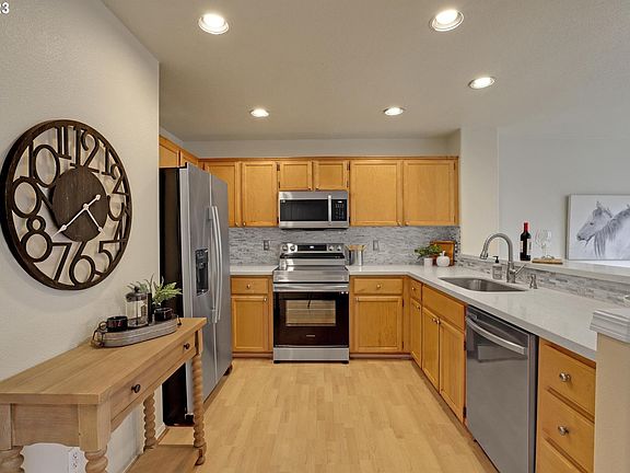 Amazing move-in ready home on a corner-lot in desirable Kaiser Woods neighborhood with top-rated schools! Conveniently located in Bethany, this home boasts 3 bedrooms and 2 ½ bathrooms, an open floor plan with many upgrades. NEW 25-Year Architectural Roof. Freshly painted interior including doors and trims. Inviting vaulted foyer with maple laminate floors on the main. Fabulous, updated kitchen with slab Quartz countertop, new stainless-steel appliances, new light fixture and a breakfast bar opens into the dining room with a slider out to the leveled, low-maintenance backyard sanctuary. 3 large-sized bedrooms upstairs with new carpeting. The primary suite features tray ceilings, ceiling fans, double vanities, and a walk-in closet. 2-Car Garage. Walking distance to Bethany Village amenities & services, parks & trails, and PCC Rock Creek. Minutes to Intel & Nike, Hwy 26, and Tanasbourne shopping & dining. Jacob Wismer, Stoller, and Westview schools. The front lawn is maintained by the HOA. Don't miss the opportunity to make this charming home yours!