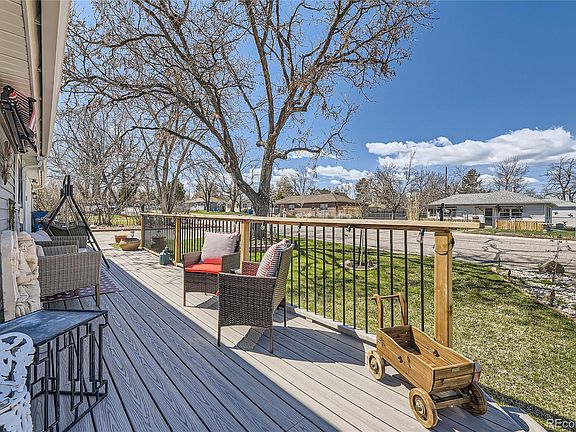 This is genuinely one-level living at its finest. It is one of the best properties near Old Town Littleton. Many updates have made this home turn-key. A warm and inviting home for family and friends. This home is remodeled with a new kitchen, new waterproof luxury vinyl flooring, two new insulated windows in the family room, new 6-panel doors, four ceiling fans with remotes, custom window treatments, new stainless steel appliances, new soft close kitchen cabinets with granite countertops, remodeled bathrooms, new light fixtures, added a skylight in the living room and new water heater. The exterior consists of a new wraparound trex deck and awning, added trees and shrubs, plus recently painted exterior and storage building. A patio in the back with a fire pit. This home has an attached two-car garage in front of the property and a detached single-car garage, plus an oversized storage unit in the backyard. A spacious sunroom with plenty of windows. It is a unique home that has many amenities that are within walking distance to Little Raven Elementary, Sterne Park, walking and bike trails, and the main street of Littleton Blvd. of restaurants, shops, breweries, a distillery, the RTD light rail/bus station, Lee Gulch, and Highline trails. The Buck Recreation Center is nearby, too.