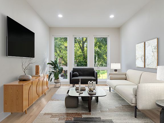 Contemporary designAbundant natural lightWaterfall-edge peninsula islandOpen-concept floor planGleaming hardwood floorsChef-inspired kitchenQuartz countertops