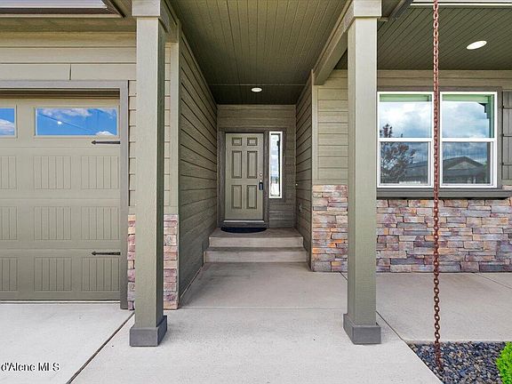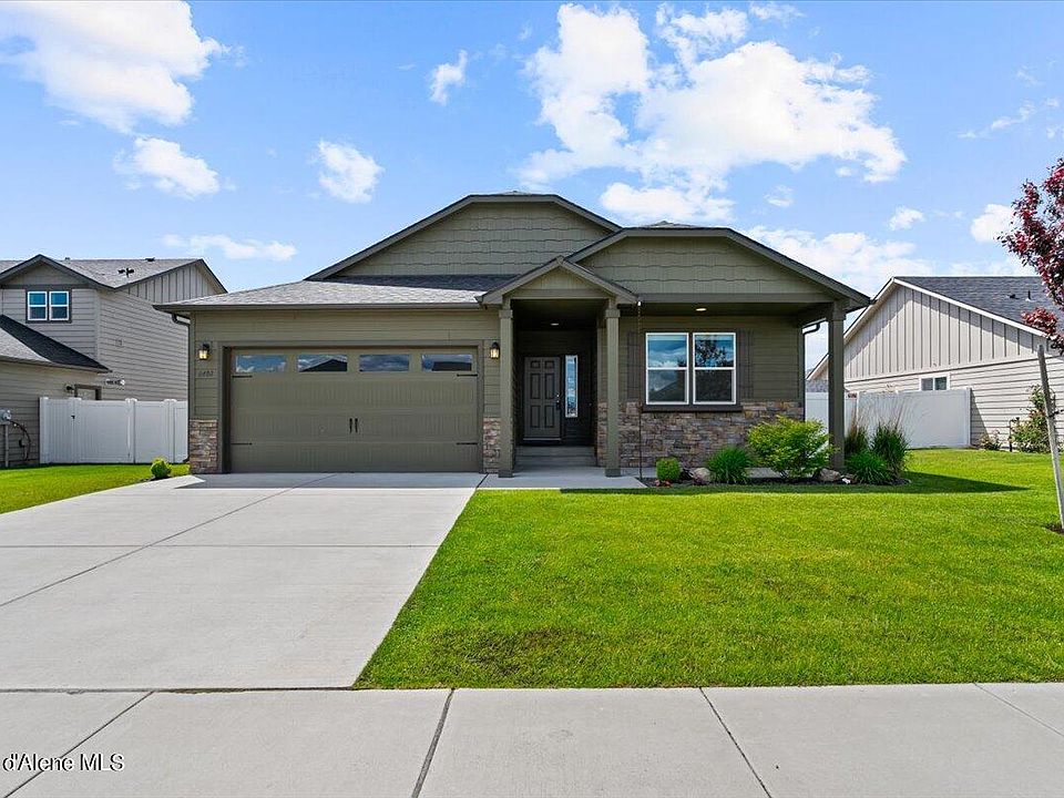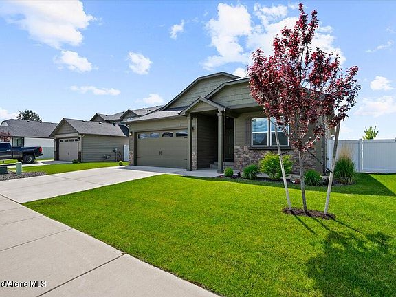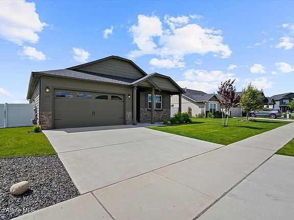One Level home with 1800 sq ft offers 3 bedrooms and 2 bathrooms. Open concept, kitchen has granite counter tops and large pantry, spacious dining area, gas fireplace in the living room, light dimmers in living area, master bedroom suite, split bedroom concept, large laundry room, garage is finished, heated and was upgraded to include 4 ft extension, back patio has been extended, concrete fire pit area, views of Rathdrum Mountain, front and back yards are landscaped with sprinklers system, fully fenced, A/C, rain gutters with French drains in the backyard. No need to wait for new construction this 4 year old home is already complete.