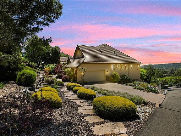 Are You Dreaming of a Single-Story Home with a Spectacular View? Welcome to your private retreat in the Sierra foothills where panoramic valley views, vibrant sunsets, and sparkling city lights set the stage for everyday living! Perched at 1400 feet, above the valley fog and below the snow line, this immaculate custom-built home is located in a National Firewise USA community! Whether you're hosting unforgettable gatherings on the covered backyard patio with built-in kitchen, or enjoying a peaceful dinner on the elevated outdoor deck, you'll be surrounded by breathtaking scenery and serene privacy. Professionally designed landscaping with rock walls and flagstone walkways creates a picture-perfect setting that's both inviting and low maintenance. Step inside to a warm and welcoming interior where neutral tones and rich wood accents blend seamlessly. Custom window treatments frame the stunning views while bathing the rooms in natural light. The open-concept design showcases sweeping vistas from the great room, kitchen, primary suite, and expansive deck.The chef's kitchen is a showstopper, featuring cherry cabinetry, a central island with prep sink, and cozy breakfast nook. New interior paint, flooring and window treatments. Make this stunning home yours today