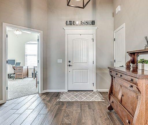 This beautiful home in Deer Creek features wide open spaces and tons of natural light! The large, open kitchen oversees the sitting space and fireplace, and features 3 cm granite countertops, an oversized kitchen island with breakfast bar, stainless steel appliances, tons of prep space and storage, designer colors, and a large walk-in pantry. The master bedroom has an ensuite bathroom with double sinks, jetted tub, walk in shower and an oversized walk-in closet. The closet also provides entry to the utility room for utmost convenience! The custom mudroom leads out to a 3 car garage where the in ground storm shelter is located. The secondary bedrooms are well sized and proportionate to the rest of the home. Outdoors, you will find refreshed flowerbeds, and an entertaining sized patio overlooking a well sized back yard! Children's swing set to stay.