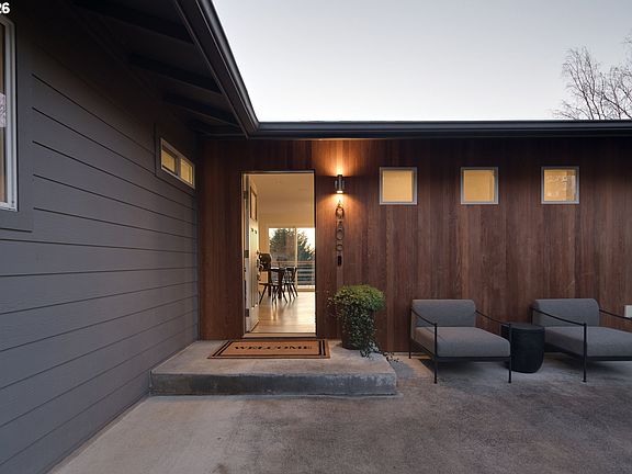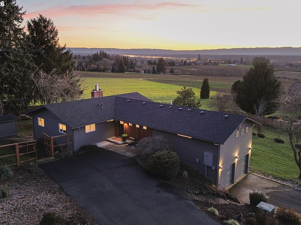 Welcome to Casa Olipop—a thoughtfully renovated mid-century retreat where design, wellness, and nature converge. Set on a picturesque, gated acre in sought-after Ridgefield, this fully fenced estate offers privacy, serenity, and an effortless connection to the land.This home has been completely remodeled with a light-filled, open-concept floor plan featuring fresh interior finishes, new carpeting, in-ceiling Sonos speakers, and seamless indoor-outdoor flow. A bright chef’s kitchen anchors the space with quartz countertops, new appliances, and clean, modern lines—perfect for both everyday living and entertaining. Cozy evenings are spent by the fire, taking in breathtaking sunset views over the surrounding landscape.The main level offers three bedrooms and two full baths, including a serene primary suite with an ensuite bath and large walk-in closet. The lower level provides flexibility with a guest or recreation living area, full bath, mudroom off the garage, private office or fourth bedroom, and a spacious bonus room ideal for a home theater or media lounge.Step directly off the kitchen onto the deck and enjoy cascading territorial views of the Oregon hills, the Columbia River, and an array of birds migrating through the nature preserve. Unwind at your private retreat featuring an outdoor sauna, deck, and cold plunge. With ample space for toys, gardens, a state-of-the-art chicken coop, and future expansion, this abundant property offers both lifestyle and opportunity. Private. Peaceful. Purposefully designed. Casa Olipop is a rare blend of mid-century character, modern comfort, and Northwest natural beauty.