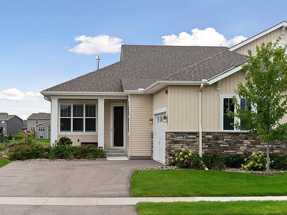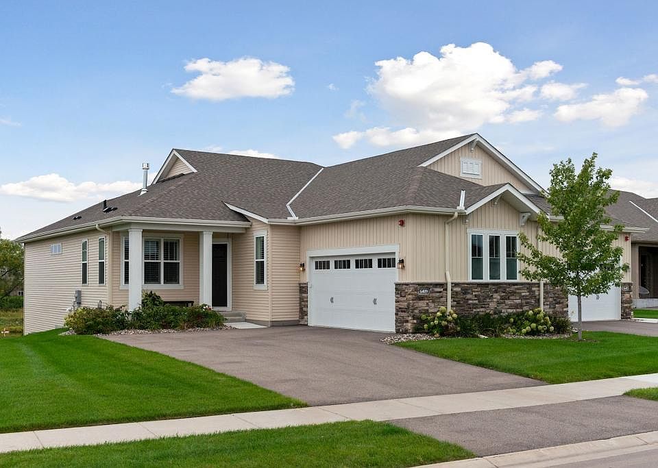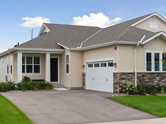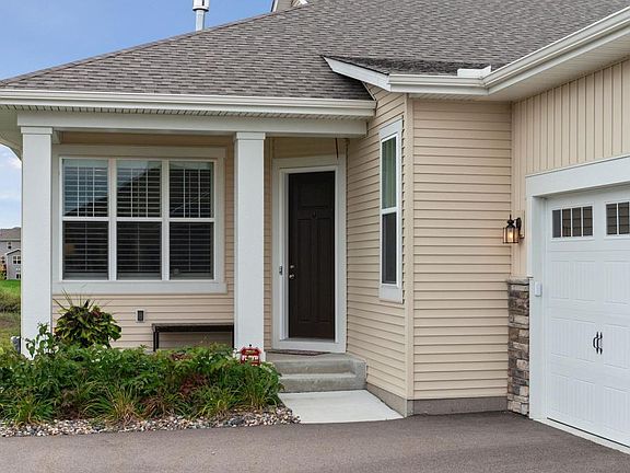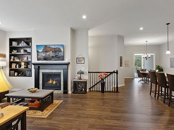 Lovely, like-new twin home with convenient main level living and open floor plan through the great room with a gas fireplace and built-in shelving, beautiful kitchen with granite counters, center island, subway tile backsplash, Whirlpool appliances and dark cabinetry with crown molding, and the dining area that leads to a large maintenance-free deck overlooking a pond in the backyard. Appreciate two main level bedrooms, including the master suite and private 3/4 en suite with double vanity, tile surround shower and large walk-in closet with sliding door, plus full bath, laundry/mud room with two closets, and office on the main level. Finished basement offers huge recreation room with lookout windows, bedroom with walk-in closet, full bath and tons of storage. Other desirable features include hardwood floors, white trim and paneled doors, 10' ceilings, and custom blinds and plantation shutters throughout. Close to Hwy 13, shopping and dining.