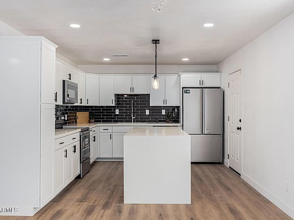 Welcome home! This delightful 5-bedroom residence offers a 2-car garage, a convenient RV gate, and an extended driveway for ample off-street parking. Inside, a spacious great room welcomes you with a soothing palette, efficient recessed lighting, blinds, and contemporary wood-look flooring. The spotless kitchen showcases quartz counters, crisp white shaker cabinets with crown moulding, a trendy tile backsplash, brand-new SS appliances, a practical pantry, and a convenient island with a breakfast bar. The main bedroom includes plush carpeting, a walk-in closet, and a private bathroom for added comfort. Venture outside to a sizeable backyard featuring a covered patio, handy storage sheds, and abundant space for crafting your dream outdoor oasis. This value is a must-see!
