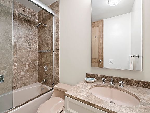 A private bedroom corridor leads to the expansive primary suite, a serene sanctuary with dramatic park and skyline views. Two walk-in closets, a dressing area with custom built-ins, and a spa-like marble bath with soaking tub, glass shower, and dual vanity complete this luxurious retreat. The secondary bedroom, equally impressive, also overlooks Central Park and offers abundant storage and a refined en-suite bath. Additional features include new central air conditioning, a powder room, and generous closet space throughout.