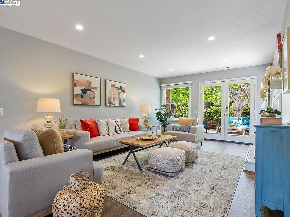 Welcome to this tastefully updated condominium townhouse located in the gated community of Centre Court. You're greeted by a spacious open floor plan combining kitchen, living room and dining area with lovely natural lighting. The home is beautifully remodeled with shaker doors and cabinets, wood floors, and freshly painted, ready for you to move right in! French doors in the living room bring the beauty of the outdoors into the home and open to a delightful landscaped yard resulting in indoor/outdoor living enjoyable to you and your guests. Also on the first floor is an entry closet, half bath, enclosed washer and dryer closet, and additional spacious closet that could be used as a large pantry or extra storage. The upstairs has a spacious hallway, large primary bedroom with ensuite, second full bath and 2 additional bedrooms. Close to scenic harbor bay trail with spectacular views of the SF Bay. shopping, SF Ferry, Chuck Corica golf course, local parks, and more!