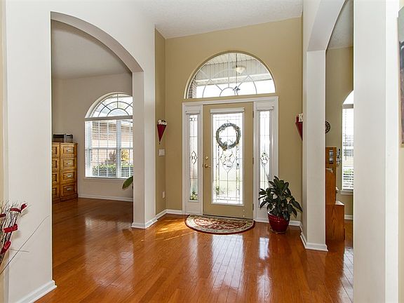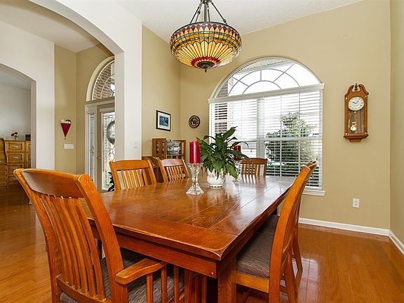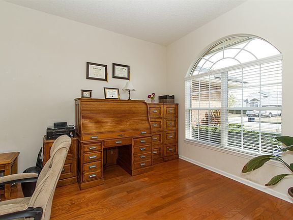 Lovely, well-appointed, split floor plan home that features beautiful hardwood floors throughout the foyer, kitchen, office, living room and breakfast area, knock down ceiling, wood-burning fireplace, separate laundry room with washer and dryer included, glass doors open to screened lanai.Kitchen has warm maple 42" cabinetry, smooth surface cooktop, breakfast bar, and separate breakfast area looking out to garden.Separate office at front of home.Owners' suite has tray ceilings, his and her vanities, deep garden tub, separate shower, and walk-in closet.Ceiling fans throughout.Transferable termite bond. Convenient location is close to grocery and outlet shopping, and neighborhood boasts tennis and basketball courts, soccer,