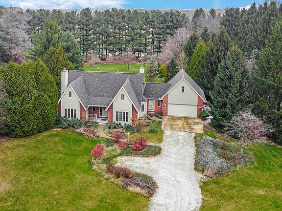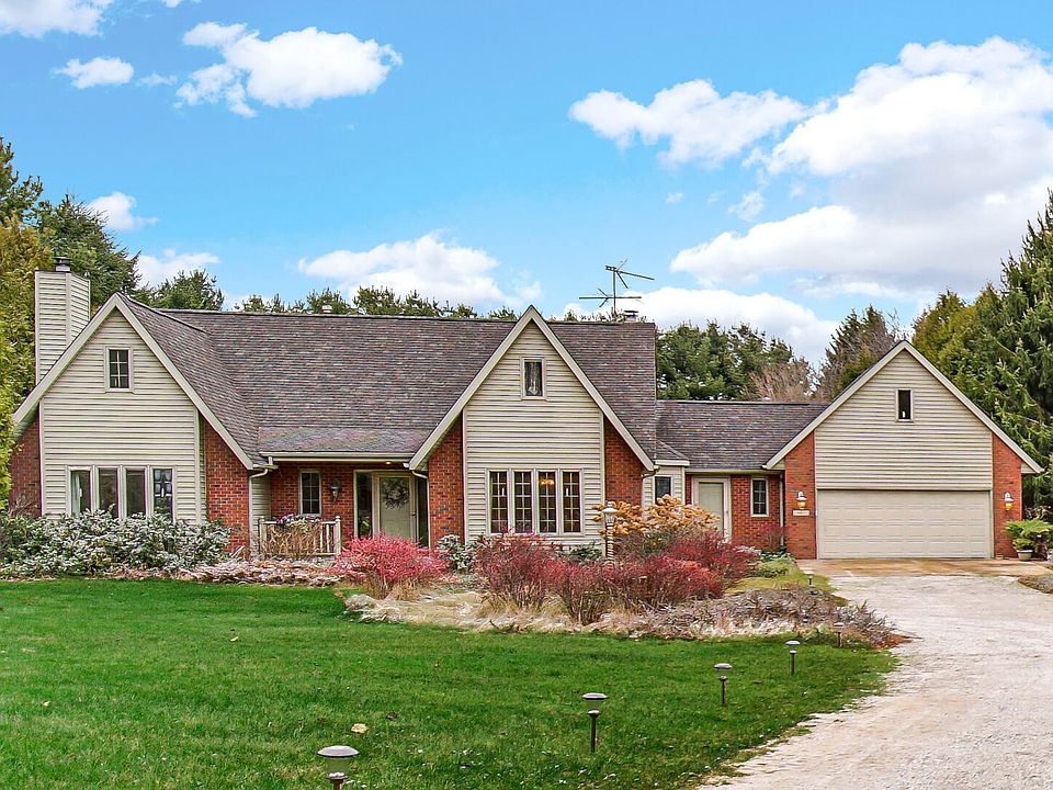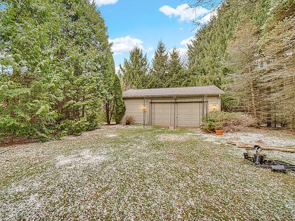 Situated on nearly 3 acres of tree-lined privacy, this 3-bedroom home offers space, comfort, and versatility. The main floor features a generously sized bedroom and a large living room and family room with a cozy fireplaces, perfect for gatherings. Enjoy stunning views of the property from the sunroom, ideal for relaxing year-round. Upstairs, you'll find two oversized bedrooms connected by a Jack-and-Jill bathroom, complete with a double vanity, separate tub, and shower. The attached heated garage includes a finished upper-level space with convenient stair access, perfect for additional storage or a creative workspace. A detached 20x36 garage provides even more flexibility for hobbies, storage, or projects. With abundant green space and mature trees, this property offers the peace and privacy you've been looking for. Don't miss this exceptional opportunity! Selling as is and cash, could use some window and door repair/replacement.