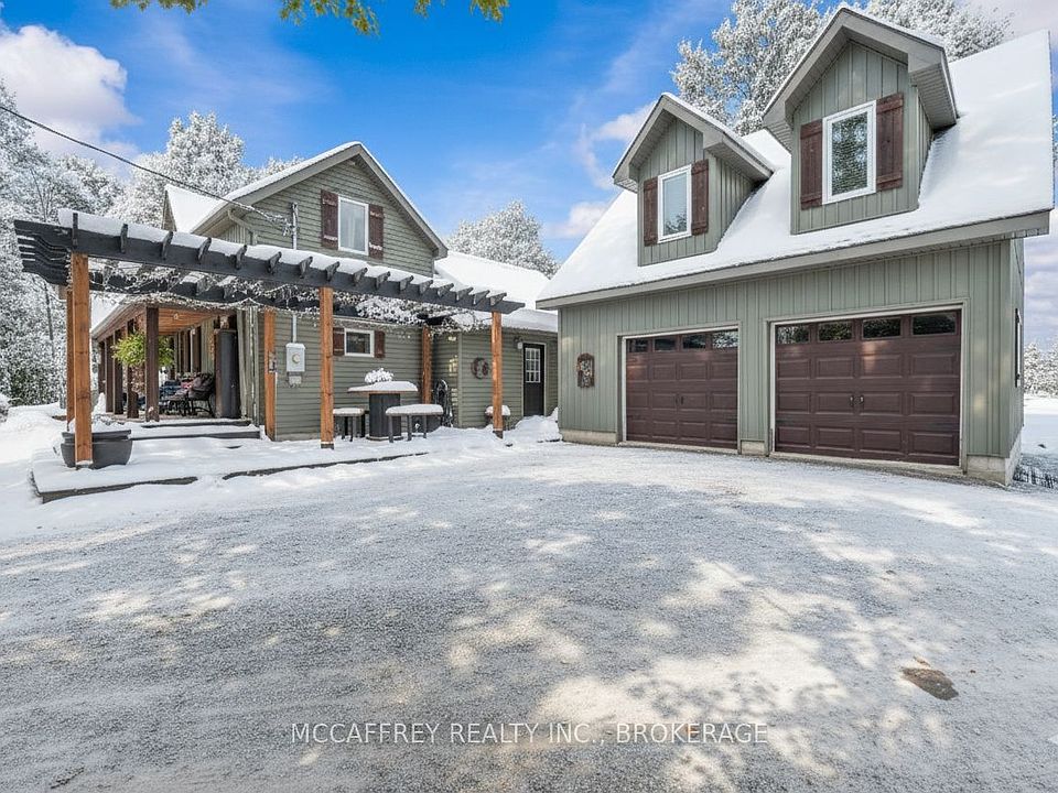 Nestled in the pristine countryside is this remarkable 1.5 story country home, perfectly situated on over 17 acres of lush property. This expansive acreage also boasts a spacious, detached two-car garage with bonus living space above, ideal for guests or a private home office. The picturesque grounds further feature fenced-in areas suitable for horse riding and a three-bay drive shed for additional storage, stimulating your pastoral idyllic dreams. Stepping onto the inviting covered porch and through the front door, you are welcomed by charming hardwood floors that guide you throughout the home. The ample kitchen area offers an island for casual meals or food prep and an under-stairs pantry closet to aid with storage. Bright and warm, the dining room is adorned with large windows that offer an abundance of natural light. Adjacent lies the cozy living room, featuring patio doors that lead to the backyard deck, providing easy outside access for those warmer days and leisurely evenings. The home also hosts a main floor space that offers the versatility to be used as a bedroom or additional family room, which conveniently provides access to the yard and laundry area. The first floor also offers a 3 piece bathroom for easy convenience. On the second level, a large primary bedroom awaits with a walk-through closet and a lovely 4 piece ensuite, truly your private retreat. A communal area that can serve as a children's play area or office space leads to an additional bedroom on this level, providing the perfect compartmentalization necessary for modern living. Outdoors, the scenery is nothing short of breathtaking. Surrounded by mature trees and immaculate landscaping, this rural haven offers boundless opportunities to enjoy nature or cultivate your personal touch to make your country dreams manifest. This property encapsulates a serene and relaxed lifestyle, harmoniously combining luxury and comfort in a rural setting.