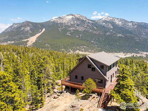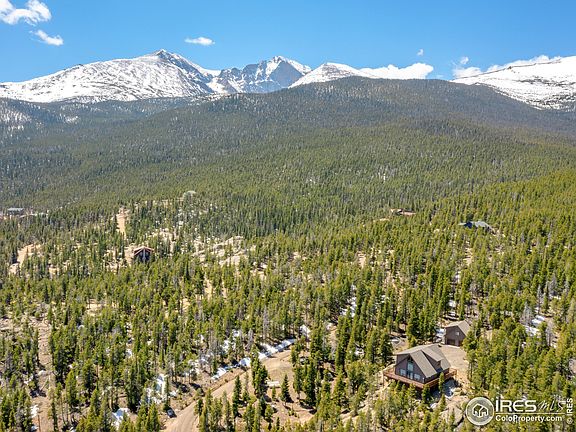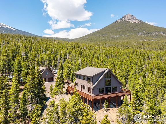 Spectacular Rocky Mountain Escape on 5.3 acres with 360 degree views including Longs, Meeker and a stunning look at Twin Sisters, BORDERING RMNP and offering endless hiking right out the back door. This totally private property was re-crafted in 2015 by Aldrich Builders to create a year-round retreat of 2262 total square feet. The main residence features a soaring greatroom and walls of windows that take in truly inspiring panoramic views. Spacious kitchen with loads of storage, hardwood floors, main level bed & bath plus upstairs there's a versatile loft space and the primary suite with private bath and walk-in closet. Wrap around deck completes the main home. Across the drive you'll find the oversized 2-bay garage that has a fantastic studio-suite above, with 3/4 bath and comfortable living/dining/kitchen... A perfect place for company to enjoy their own private getaway. A special place with those amazing views and total privacy among the rocks & trees of a magical forest...