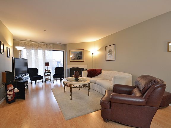 Desirable end unit condo in popular Chatham subdivision. Spacious dinning room, living room with sliding doors to oversized balcony and cozy wood-burning fireplace. Fully applianced ceramic tile floor kitchen features eat-in area and sliding doors to 2nd balcony. Solid laminate flooring throughout, large master bedroom with private bath, washer/dryer in unit, heated parking space #16 and storage #207 in underground garage. Elevator building, close to shopping and transportation. Unit is in perfect move-in condition and ready for new owner.