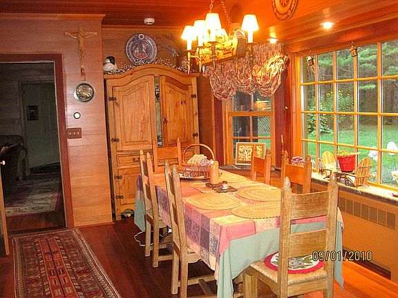This truly unique well-maintained Adirondack estate is located on 5.3 acres of land, with a detached 2 car garage with additional 2 bedroom/1 bath apartment. Attractive open kitchen/dining area with custom cabinetry and decorative wood burning stove. Hardwood floors throughout and 2 large fireplaces. Main level library with adjoining bathroom offers additional bedroom as needed. Second level has 3 bedrooms and 2 full bathrooms. Large enclosed porch and charming sun porch. Spacious yard with perennial and vegetable gardens, tool shed, decorative pond and fire pit area. Short walk to shared beach. Furnishings are negotiable.