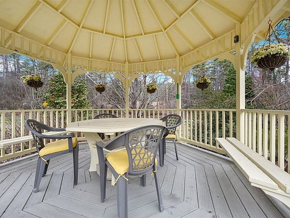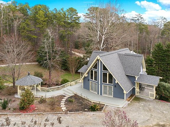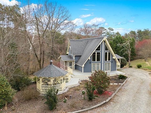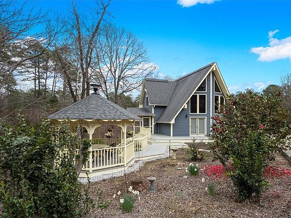 The current owner designed & built this masterpiece of a home with meticulous quality & creative detail. It has only been used as a family vacation home & the impeccable maintenance & care are evident throughout every inch of the property. The homes's visual centerpiece is the 27-foot tall "A" frame living room. The main level also has 2 bedrooms, one full bath, kitchen & laundry space. Upstairs, the primary suite features a balcony view out to the wall of windows, a seating area, a full bath with jetted tub, 3 walk-in closets, & bedroom featuring 2 skylights & a unique outdoor balcony. The full basement has 10-foot ceilings, a full bathroom, & plenty of space to leave your boat & create more bedrooms if you wish. A door opens into the attached utility storage space. Other details to note are 9' ceilings throughout, cement plank exterior siding & cedar trim, screened porch, & covered side porch (new in 2021), new water heater (2024), and the roof was replaced in 2015. The yard is just as unique as the home, with just the perfect setup of decking (replaced 2021), a gazebo & a spiral staircase leading to the basement level. Landscaping is in bloom much of the year. We have a row of gardenias and roses that are just about ready to fill the area with fragrance, a large producing Bell of Georgia peach tree, banana, cherry, dogwood, locust, hickory, black walnut, & 2 pecan trees; JUST TO NAME A FEW! There is more to see. Take a look ASAP!