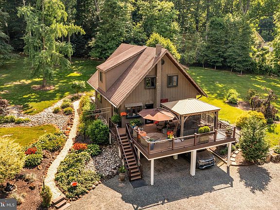Tranquility awaits at this custom, Swiss chalet that exudes character and charm! Nestled on almost 3 acres in a retreat-like setting and located just minutes from Green Lane Park and reservoir, this is a dream location and setting for nature lovers, outdoor enthusiasts and those seeking privacy in a serene setting. Head down the driveway to your own private paradise with bucolic, sprawling grounds with magical gardens and a privacy buffer of mature perimeter trees. Meander along a lovely path through gorgeous and lush gardens as you head to one of two decks, providing a fantastic integration of indoor and outdoor spaces. Upon entering the home, you will immediately feel a sense of warmth and coziness. Gorgeous hardwood floors throughout the main level, custom wood paneling, incredible natural light and an abundance artistic and inviting finishes throughout. The open floor plan of the living room and dining room is a wonderful space for gatherings. Head into the bar room / den with a live edge bar countertop and access to the larger deck with gazebo to enjoy this relaxing outdoor living space. The covered deck area is also accessible from the updated eat-in kitchen with center island, custom painted cabinets and tile backsplash, quartz countertops, stainless steel appliances, gas cooking and recessed lighting. The main level also provides a powder room for guests. The upper level of the home offers a spacious primary bedroom suite with cathedral ceiling and a solarium that is a lovely space for a sitting room, artist studio or the perfect place for plants to thrive! The primary bathroom includes a shower with floor to ceiling subway tiles and newer fixtures. There are two additional bedrooms that share a full hallway bathroom with tub and shower combo. The lower, walk-out level is a fantastic flexible space that can be used as additional living space, home theater, fitness room, storage, workshop and more! The laundry room is located on this level. The house provides carport parking for 2 cars. Located just across the driveway is an incredible and spacious 32 ‘ x 24’ barn / detached garage with a 10’ overhang with roll-up / roll-down enclosure. This 2-story building includes electric, HVAC, water, spray foam insulation and is built on a concrete slab. It can provide parking for 6 cars; 4 cars inside and 2 cars under the overhang. Sky is the limit for this stunning and quality-built bonus building. A great space for car collectors, hobbyists, artists, contractors, toys and the best man-cave one could ever imagine! More about the area amenities and location. Green Lane Park system is comprised of over 3,400 acres of open space, 3 bodies of water and over 25 miles of trails, nature preserves and offers a variety of year-round, outdoor activities and programs. It's an equestrian and outdoor lovers' paradise with 25 miles of trails for horseback riding, mountain biking and hiking. Enjoy fishing, boating, picnicking and playgrounds. Winter enthusiasts can cross-country ski, ice fish or ice skate. The park also offers summer concerts and family-oriented, environmental education programs on weekends. Enjoy the natural beauty and tranquility of this setting through all seasons. A true nature lovers paradise. Great location! Just 10 miles to Lehigh Valley, 25 miles to King of Prussia, 40 miles to center city Philadelphia and 90 miles to Manhattan. This property is truly a must-see!