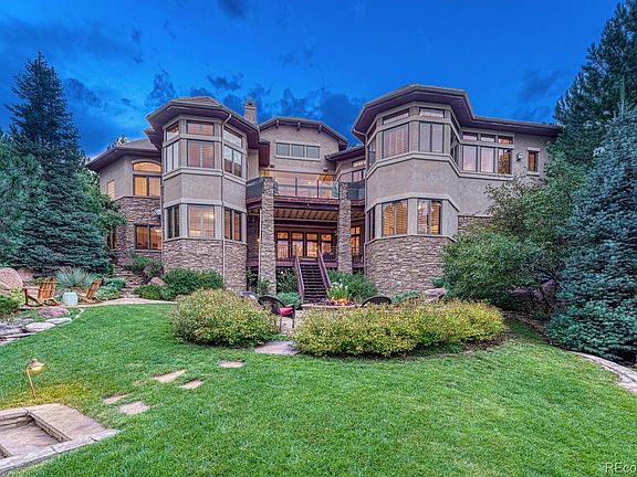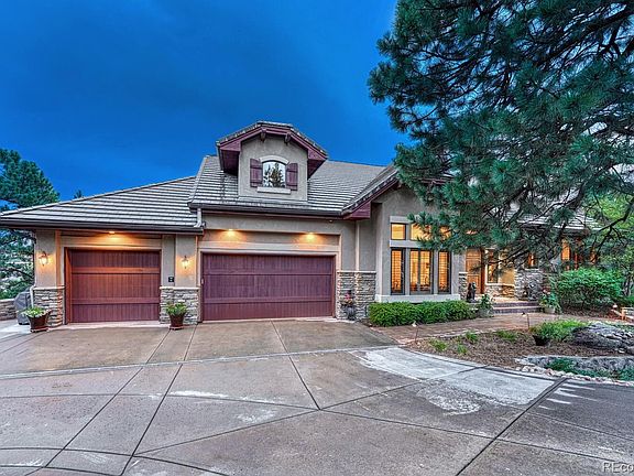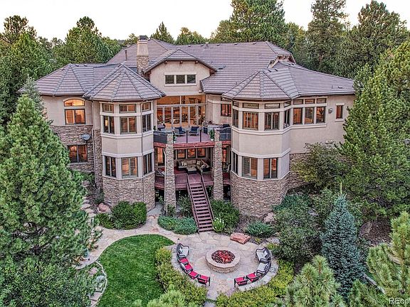 Discover the elegance of Castle Pines Village, nestled at the end of a serene cul-de-sac. This luxurious retreat features a captivating 3-tier water feature and stunning landscaping leading to an impressive entrance. Inside, the warmth of Brazilian Cherry floors and travertine tiles set the stage. The home boasts a cozy den, spacious formal dining room, and a chef's dream kitchen with a custom island sink, high end appliances, ample storage, and an adjacent family room - perfect for entertaining and staying connected. The sunken living room, complete with accordion doors, opens to a deck and outdoor kitchen offering breathtaking views of Castle Rock and the Front Range. The luxurious main floor primary suite features vaulted ceilings, a fireplace, a custom closet, and a 5-piece ensuite, creating a private and peaceful retreat. The lower level features a great room with access to the 'dry deck' and beautiful stone and woodwork, a full bar, climate controlled wine cellar, and a game room, which could also be used as a home theater or gym. Additionally, there are three guest suites, each with a private bath and walk-in closet. Outdoor living is elevated with multiple decks, a large gas firepit, putting green, and a mesmerizing and peaceful waterfall. Updated with a new 4-unit HVAC system, air purification, steam humidifier, water purification, and tankless water heater, this home is move-in ready. Experience the joy of a Colorado staycation every day in this exquisite home. CPV HOA includes 3 pools, a fitness facility, pickleball courts, tennis courts, multiple parks, and 14 miles of walking & biking trails. The community is gated and staffed with 24/7 emergency services and alarm monitoring tied to your security system. The community includes two of Colorado's best nationally rated private golf courses, The Country Club at Castle Pines and The Castle Pines Golf Club.
