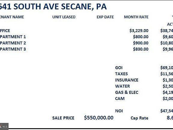 This Mixed-Use investment +/- 4,400SF corner property consists of a long-term medical office user on the first floor(+/- 2,200 SF) along with 3 residential apartments on the second floor that are leased and 100% occupied. There is a private parking lot with 12 spaces for the building. Excellent exposure and signage up against South Ave. The building is within 3 miles to the Blue Route and 5 miles to the Center City Philadelphia.