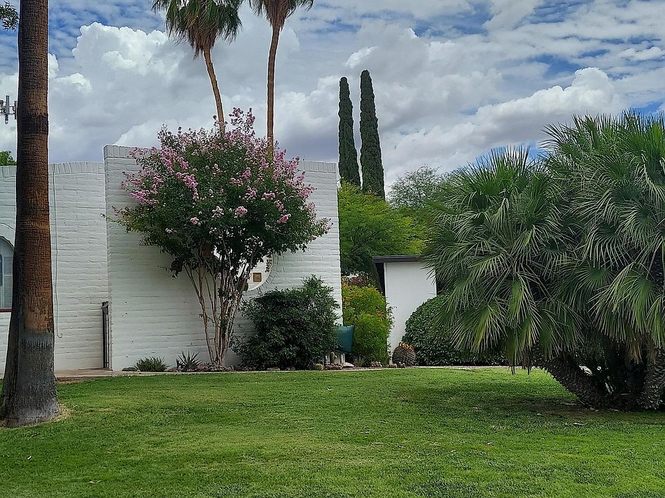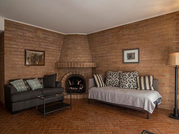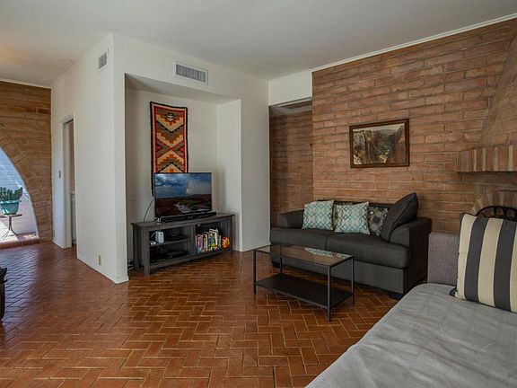 This unique unit has the southwest ambience with archways, beehive fireplace and custom brick floors. Two separate patios, one for the entrance to welcome your guests and a private interior patio off master and kitchen. Separate storage with washer and dryer which convey plus carport storage bonus. Location, magnificent. Close to Tucson mall, multitude of restaurants and shopping galore. In this 55+ the grounds are peaceful and impeccably kept. Pool is a short stroll. It's the easy living you deserve!