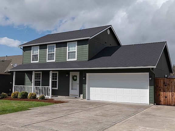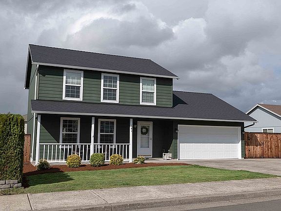 Beautifully maintained, move-in ready, 3 bedroom, 2.5 bath, 2-story home with attached garage with side entry, gated RV parking, and central AC with heat pump. Inviting main entry with viewpoints throughout the first floor and a welcoming feature fireplace wall with mantle. The living room flows seamlessly into the dining room and kitchen areas, where you'll find an oversized kitchen island, stainless steel appliances, and French doors leading to the back patio. The downstairs also boasts a large entry closet, 1/2 bath, laundry room, and garage entry just off the kitchen. The upstairs features a spacious master bedroom with vaulted ceilings and adjoining bathroom, two more bedrooms, and the primary bath at the top of the stairs. French doors off the dining room lead to the back patio and fenced backyard, where you can relax and watch the sunset, view the rolling hills, hear the frogs chirping from the nearby wetlands, or warm yourself by the firepit. The spacious backyard also has a lawn/garden shed, 6'x21' concrete slab for a dog run or a rectangular greenhouse, and plenty of room remaining for a pool if you want to add one. Recent updates include new roof and gutters (fall 2022), 50 gallon water heater, garage door springs, luxury vinyl plank and 4" trim throughout, newer ceiling fans in living room and master bedroom, bluetooth speaker/light/fan combo in the upstairs bathrooms, fresh paint throughout, LED lights and Cat-6 cable in each room, and surround sound wired in living room and master bedroom. Easy access to downtown Stayton and Highway 22.